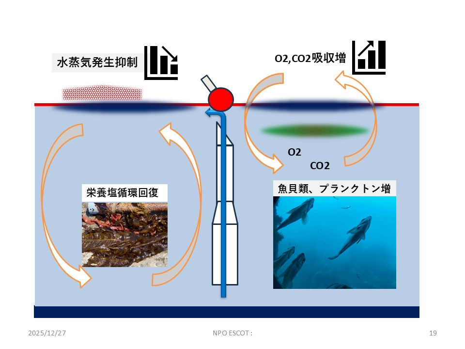 本提案は、牡蠣養殖におけるへい死対策として、単なる冷却や曝気を目的とするものではなく、夏季に見逃されがちなヒートレイヤーと、それに伴うガス交換および鉛直混合の不全という物理的課題に着目した試験的取り組みである。