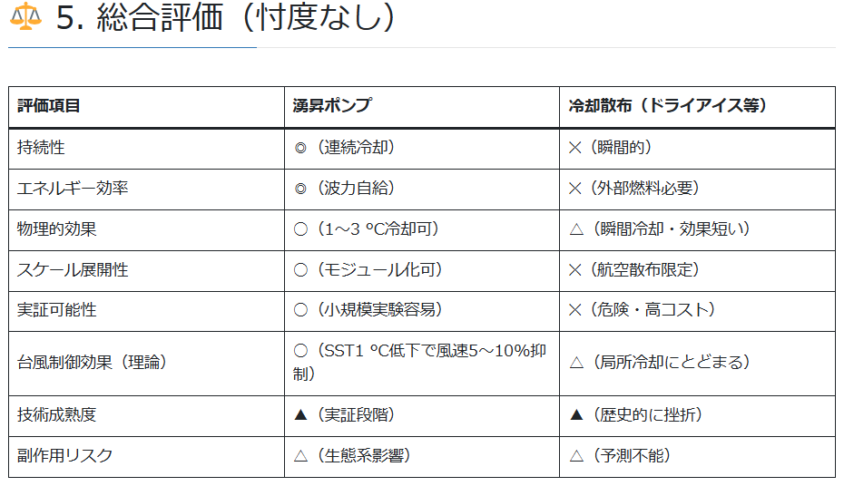 Possibility of typhoon control = Evaluation and comparison with national projects using AI / Third-party evaluation based on overseas papers and cases Related materials: ”Limits of artificial ocean cooling in typhoon control and wave-actuated upwelling pumps” Related materials: ”Evaluation of wave-actuated upwelling pumps as a means of typhoon mitigation”